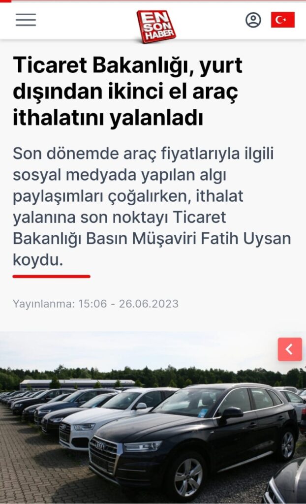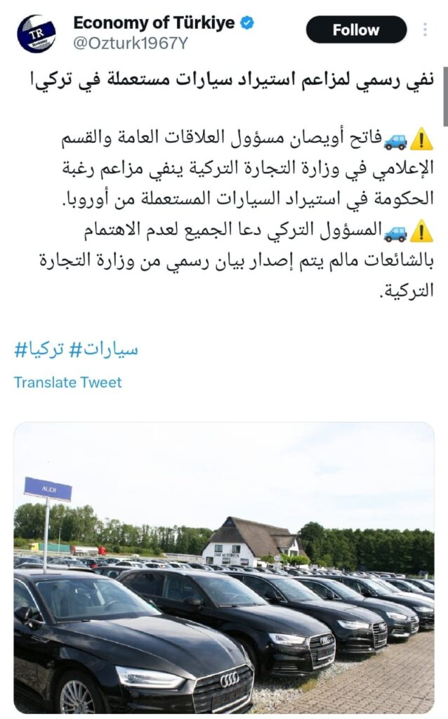 نفى فاتح أويصان، مسئول العلاقات العامة والقسم الإعلامي في وزارة التجارة التركية، صحة ما تم تداوله بشأن رغبة الحكومة في استيراد السيارات المستعملة من أوروبا، داعيا جميع المواطنين لعدم الاهتمام بالشائعات ما لم يتم إصدار بيان رسمي من الوزارة، وذلك وفق تصريحاته لوسائل إعلام تركية.