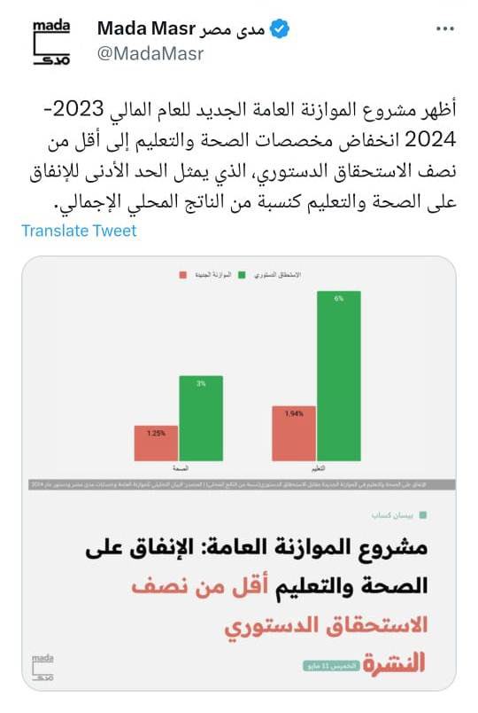 تداولت مواقع إلكترونية وحسابات تواصل اجتماعي بالأيام الماضية أنباء عن قيام وزارة المالية المصرية بتقليص المخصصات المالية لقطاعي الصحة والتعليم لأقل من نصف الاستحقاق الدستوري في الموازنة العامة الجديدة 2023/2024، مما أثار تكهنات حول إمكانية تأثر كفاءة الخدمات الصحية والتعليمية المقدمة للمواطنين نتيجة هذا التقليص المالي.