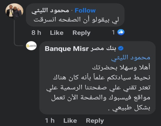 وقال بنك مصر، ردا على تعليقات أحد العملاء، إن الصفحة الرسمية لبنك مصر، على فيسبوك، تعرضت لعطل تقني فقط منذ ساعات، مضيفًا أنه تم الانتهاء من حل العطل.