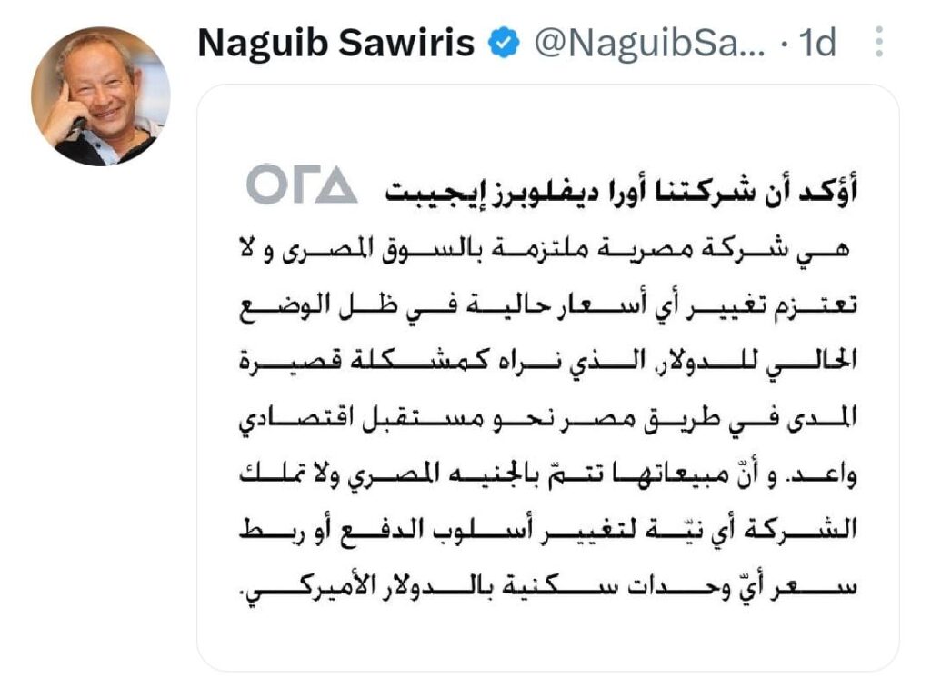 نفى رجل الأعمال، المهندس نجيب ساويرس، اعتزام شركته “أورا ديفلوبرز إيجيبت” العقارية تغيير أي أسعار حالية في ظل الوضع الحالي للدولار، مؤكدًا أن الشركة المصرية ملتزمة بالسوق المصري ولا تنوي رفع أسعارها حاليًا.