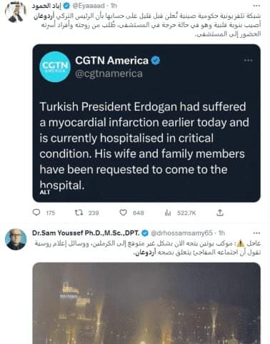 تداول رواد مواقع التواصل الاجتماعي في الساعات الأخيرة أنباء تفيد بإصابة الرئيس التركي رجب طيب أردوغان بنوبة قلبية حادة، وذلك عقب إلغائه للتجمعات الانتخابية التي كان من المقرر عقدها هذه الأيام لأسباب صحية، مما أثار جدلًا وتساؤلات حول الحالة الصحية للرئيس التركي.