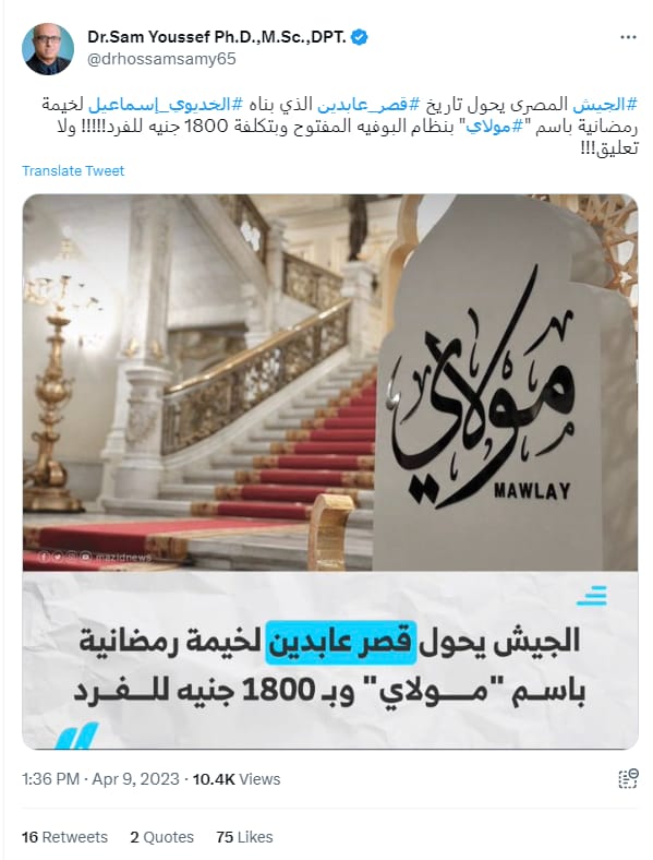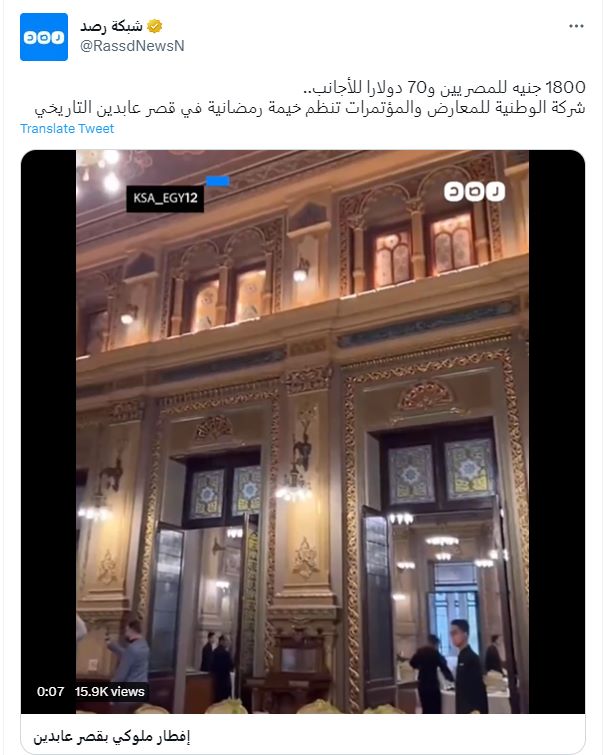 في الساعات الأخيرة أثار خبر افتتاح مطعم داخل قصر عابدين التاريخي حالة من الجدل على منصات التواصل الاجتماعي، ووجه الكثيرون الاتهامات للجيش المصري باعتباره صاحب تلك “الخيمة الرمضانية” التي تنتهك قيمته التاريخية بهدف التربح. وادعى البعض أن تحويل القصر إلى مطعم بشكل دائم سيجعله عرضه للتشويه واتلاف القطع الأثرية داخله.