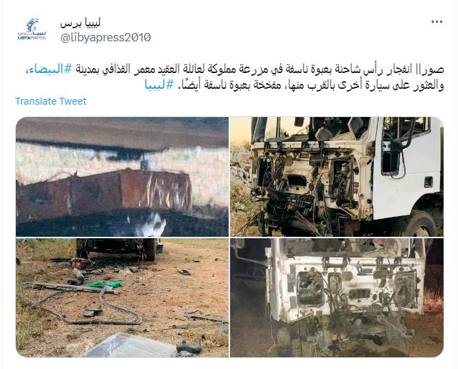 نشرت منصات تواصل اجتماعي في الساعات الماضية أنباء عن وقوع حادث إرهابي بمدينة البيضاء في ليبيا، وقيل إن إرهابيين قاموا بتفجير شاحنة بعبوة مفخخة داخل مزرعة مملوكة للرئيس السابق معمر القذافي، كما تم العثور على سيارة مفخخة أخرى بالقرب منها، مما أثار القلق والذعر لدى متابعي وسائل التواصل الاجتماعي من الليبيين.