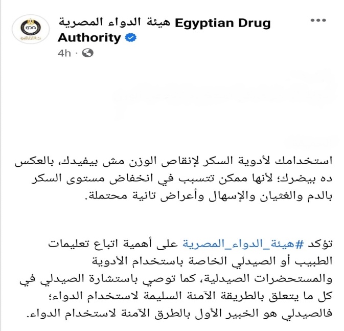 وقالت الهيئة عبر صفحتها على موقع فيسبوك: “استخدامك أدوية السكر لإنقاص الوزن مش بيفيدك، بالعكس ده بيضرك؛ لأنها ممكن تتسبب في انخفاض مستوى السكر بالدم والغثيان والإسهال، وأعراض تانية محتملة”.