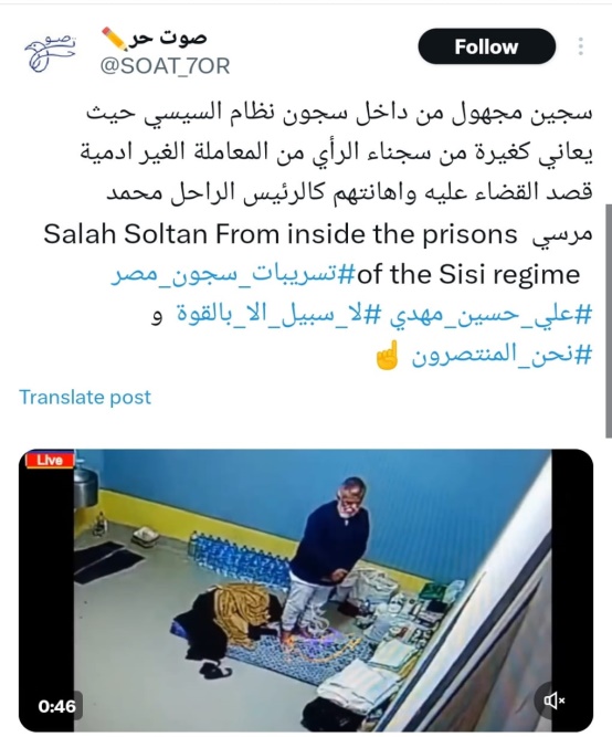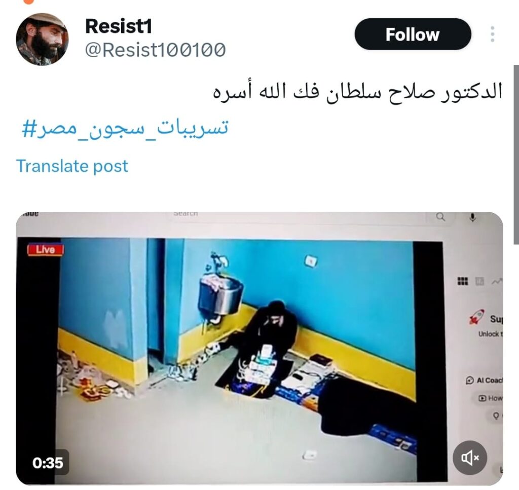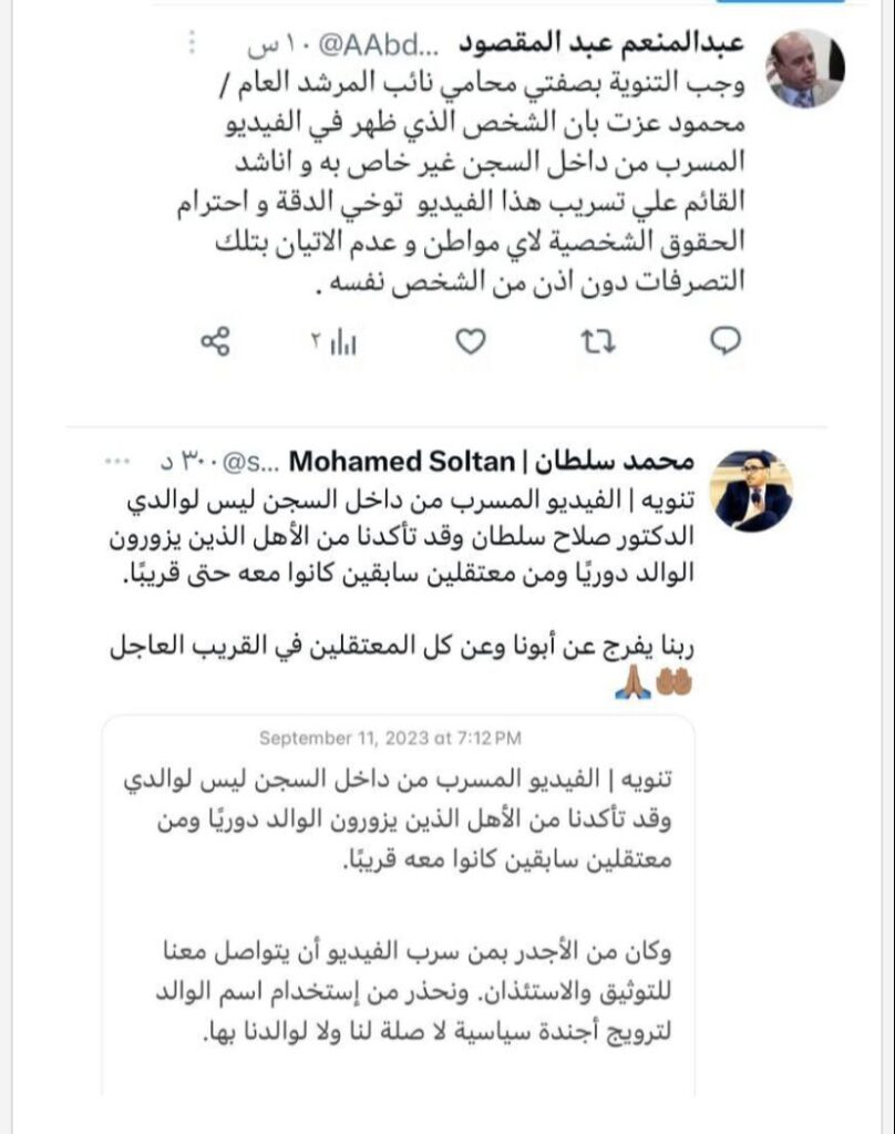 تداولت عدد من حسابات وسائل التواصل الاجتماعي في الساعات القليلة الماضية، مقاطع فيديو زعمت أنها مسربة لنزلاء داخل أحد مراكز الإصلاح والتأهيل المصرية، حيث قيل إنها ربما تكون لاثنين من عناصر جماعة الإخوان إما صلاح سلطان أو محمود عزت، الأمر الذي أثار بعض التساؤلات حول صحة هذه المقاطع.
