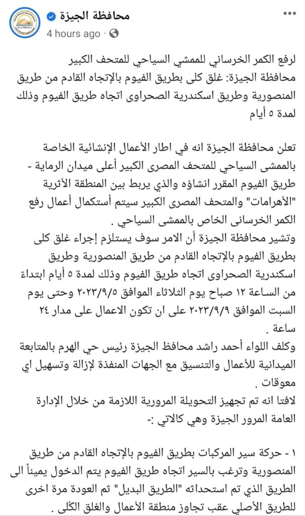 أعلنت محافظة الجيزة، في بيان رسمي، أن الغلق سيكون كليًا لمدة 5 أيام وليس جزئيًا، وذلك لتنفيذ أعمال إنشائية خاصة بالممشى السياحي للمتحف المصري الكبير أعلى ميدان الرماية – طريق الفيوم، والمقرر إنشاؤه ليربط بين الأهرامات والمتحف المصري الكبير، على أن يتم استكمال أعمال رفع الكمر الخرساني الخاص بالممشى السياحي.