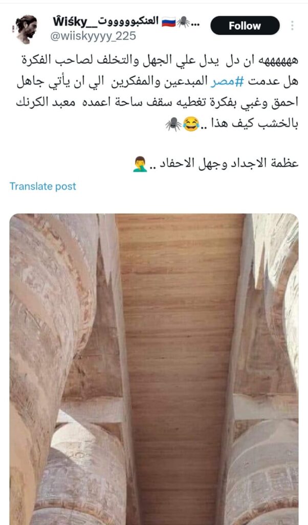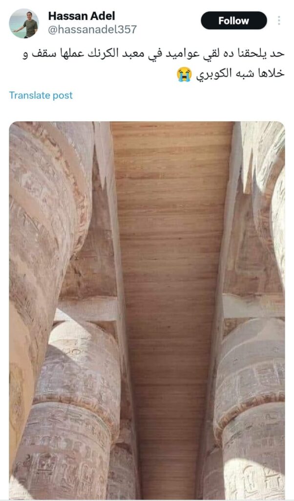 سادت حالة من الجدل على وسائل التواصل الاجتماعي في مصر بالفترة الأخيرة، بعد انتشار صور لتركيب سقف خشبي فوق الأعمدة الأثرية الشهيرة بمعبد الكرنك في مدينة الأقصر المصرية، الأمر الذي اعتبره البعض بمثابة تخريب وتشويه لمعلم أثري مهم من بين الأبرز في العالم.
