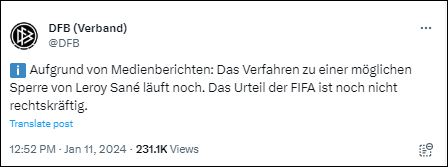 وقال بيان الاتحاد الألماني لكرة القدم، عبر حسابه الرسمي على منصة «إكس»: “قرار الاتحاد الدولي لكرة القدم بشأن الإيقاف المحتمل لـ ليروي ليس نهائيا بعد”.