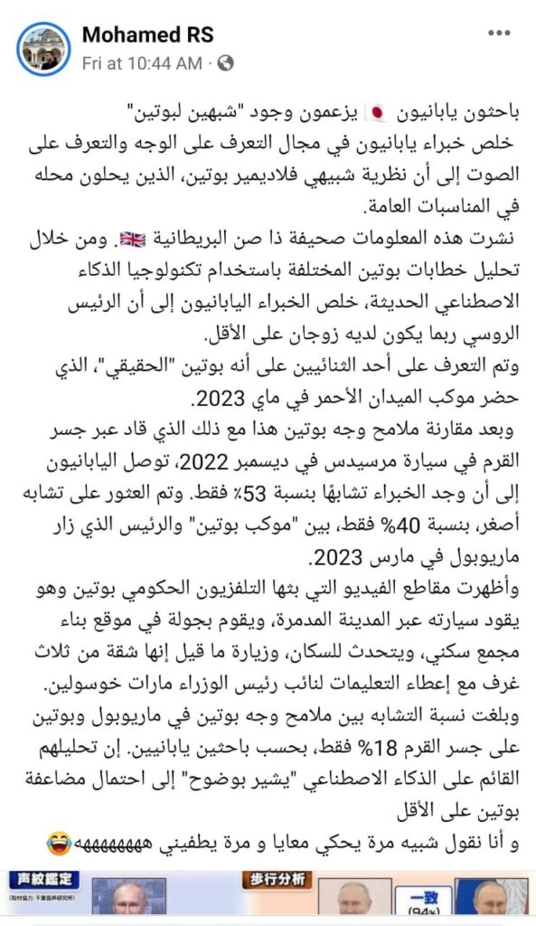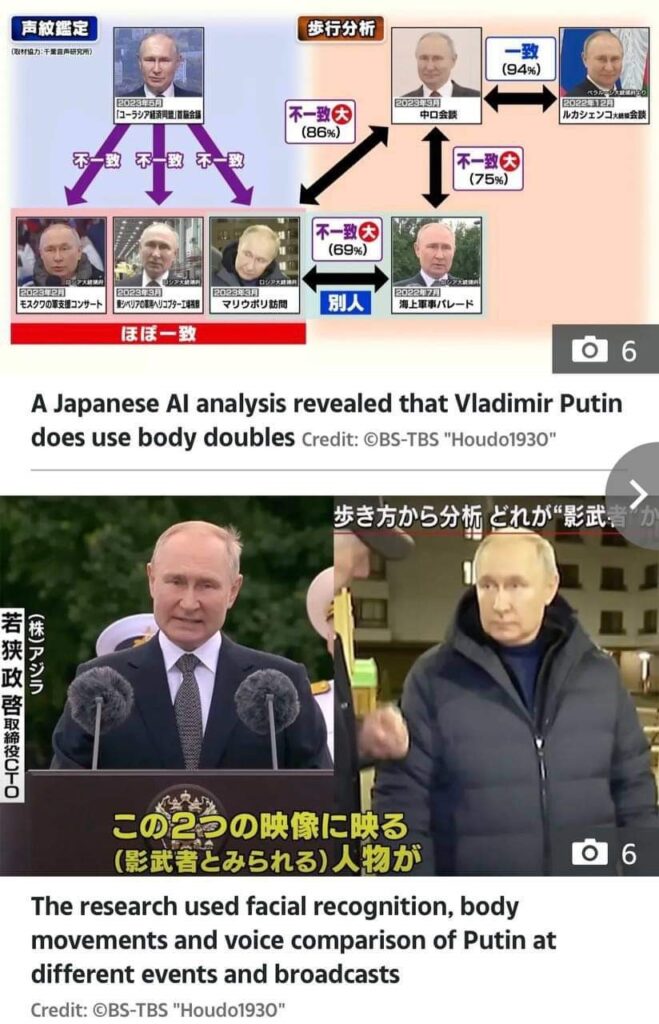 ترددت على بعض حسابات وسائل التواصل الاجتماعي بالأيام الماضية، معلومات حول تأكيد خبراء يابانيين، متخصصون في مجال التعرف على الوجه والصوت، على أن الرئيس الروسي فلاديمير بوتين لديه أشباه يحلون محله في المناسبات العامة، حيث خلصت دراسات هؤلاء الباحثين إلى أن بوتين لديه شبيهين على الأقل، مما أثار حالة من الجدل تجاه صحة هذه المعلومات.