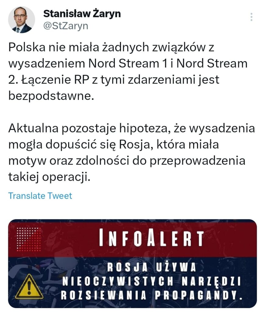 نفى ستانيسلاف زارين، المتحدث بإسم الوزير المنسق لجهاز الخدمات الخاصة البولندي (الاستخبارات البولندية)، أن يكون لبولندا أي علاقة بالتفجيرات التي طالت خطوط أنابيب السيل الشمالي، بحسب تغريدة نشرها على حسابه الرسمي بموقع “تويتر”.