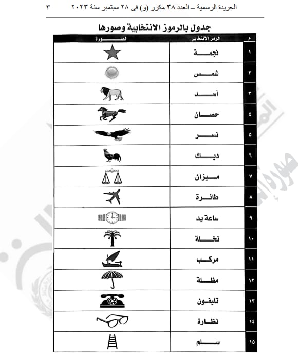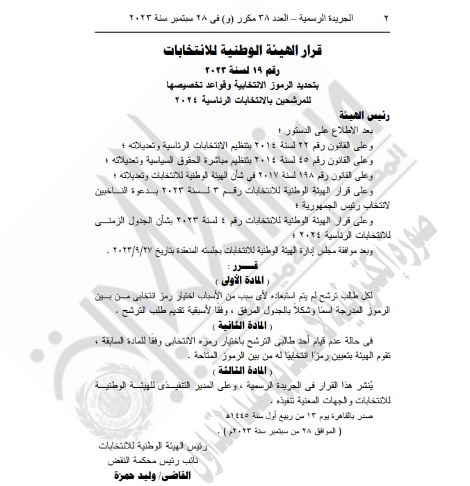 نشرت الجريدة الرسمية قرار الهيئة الوطنية للانتخابات رقم 19 لسنة 2023 بتحديد الرموز الانتخابية وقواعد تخصيصها للمرشحين بالانتخابات الرئاسية 2024.