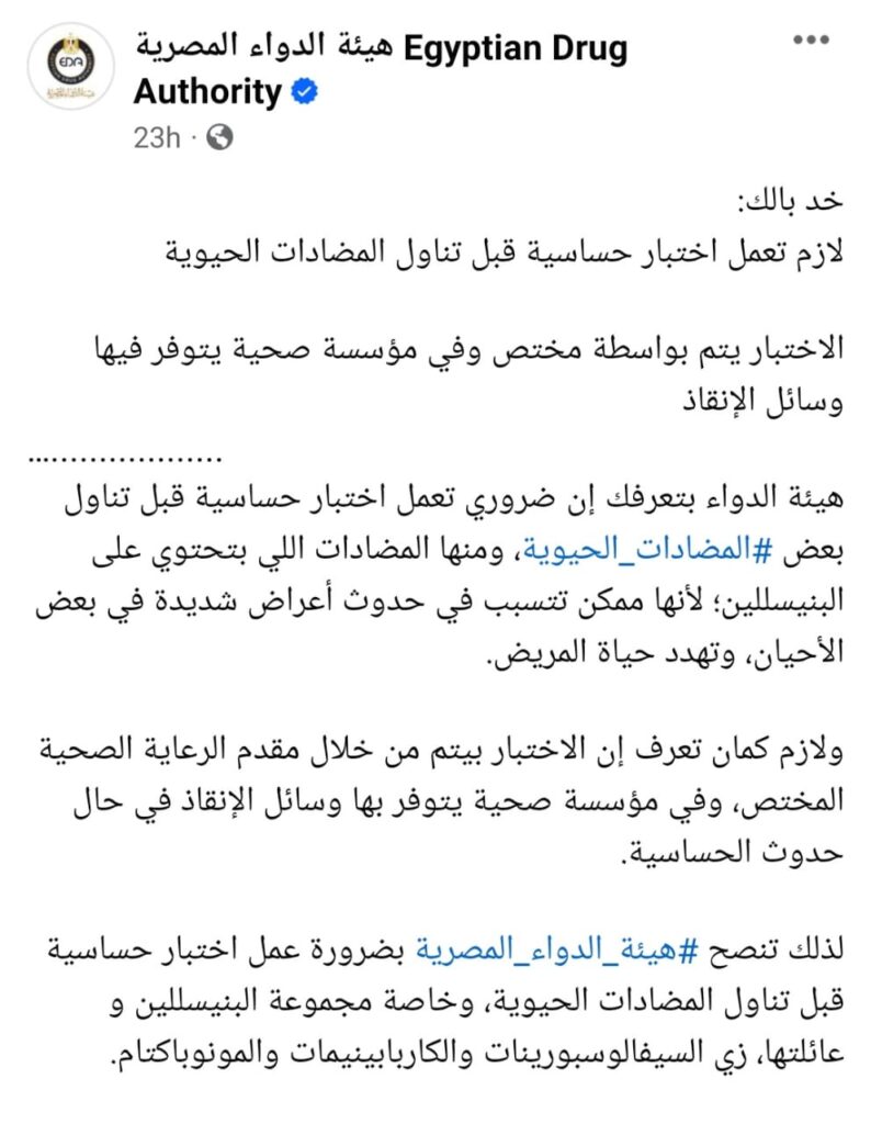 أكدت هيئة الدواء المصرية أهمية إجراء اختبارات الحساسية قبل تناول بعض المضادات الحيوية، وخاصة تلك التي تحتوي على البنسلين مثل السيفالوسبورينات والكاربابينيمات والمونوباكتام.