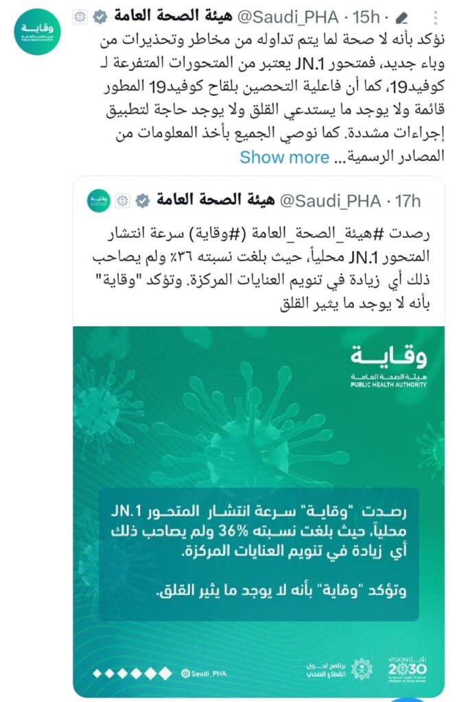 وكانت هيئة الصحة العامة السعودية قد أعلنت إنه تم رصد سرعة انتشار المتحور الجديد لفيروس كورونا JN.1، حيث بلغت نسبته 36%، مشيرة إلى أنه لم يصاحب ذلك أي زيادة في تنويم العنايات المركزة، مؤكدة عدم وجود ما يثير القلق.