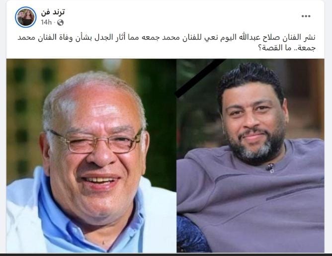 تداولت صفحات على منصات التواصل الاجتماعي في مصر بالساعات الماضية، أقاويل بشأن وفاة الفنان المصري محمد جمعة، وذلك على خلفية نشر الفنان الكبير صلاح عبدالله تدوينة تشير إلى ذلك، مما أثار حالة من القلق لدى محبي جمعة.