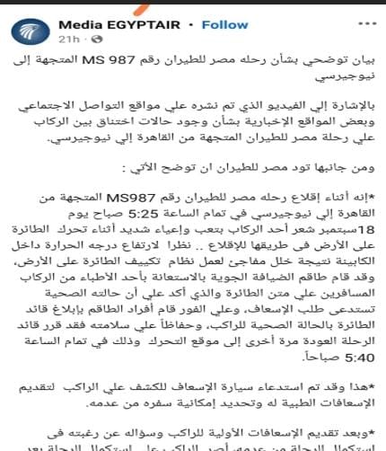 أوضحت الشركة الوطنية مصر للطيران، أن حقيقة الواقعة تتمثل في أنه أثناء إقلاع رحلة مصر للطيران رقم MS987 المتجهة من القاهرة إلى نيوجيرسي في تمام الساعة 5:25 صباح يوم 18 سبتمبر الجاري، شعر راكب واحد فقط بتعب وإعياء شديد أثناء تحرك الطائرة على الأرض في طريقها للإقلاع، نظرا لارتفاع درجة الحرارة داخل الكابينة، نتيجة خلل مفاجئ لعمل نظام تكييف الطائرة على الأرض.