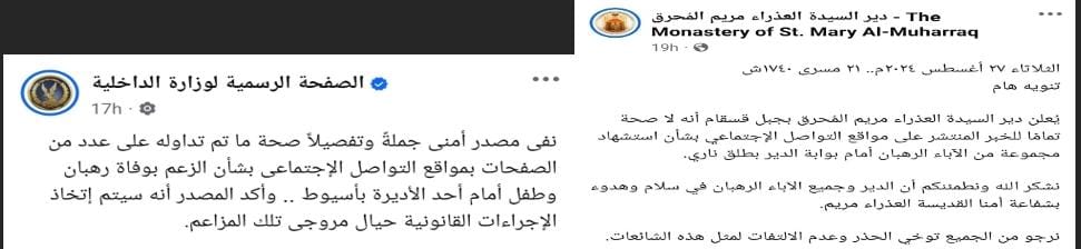 كما نفى دير المحرق بأسيوط، في بيان رسمي، وقوع أي هجوم على الدير ووفاة رهبان، مؤكدا أن الدير يعيش في هدوء واستقرار ويمارس حياته بشكل طبيعي، وهناك دائمًا تواجد أمني خارج أسوار المكان.