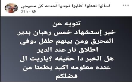 وشدد دير المحرق على أن جميع الآباء الرهبان بخير، مناشدا الجميع بتوخي الحذر وعدم الالتفات لمثل هذه الشائعات.