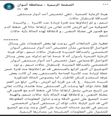 وحثت هيئة الرعاية الصحية بأسوان الجميع على تحري الدقة وعدم تداول المعلومات المغلوطة التي قد تثير البلبلة، مؤكدة أن مستشفى أسوان التخصصي مستمر في تقديم خدماته الصحية على أكمل وجه.