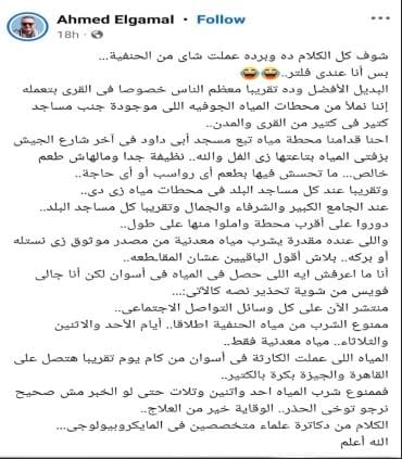 وقال المصدر إن كل ما يتم تداوله عارٍ تمامًا عن الصحة وغير حقيقي بالمرة، مؤكدًا أن المياه في القاهرة والجيزة لا يوجد بها أي مشاكل.