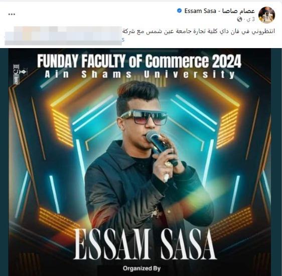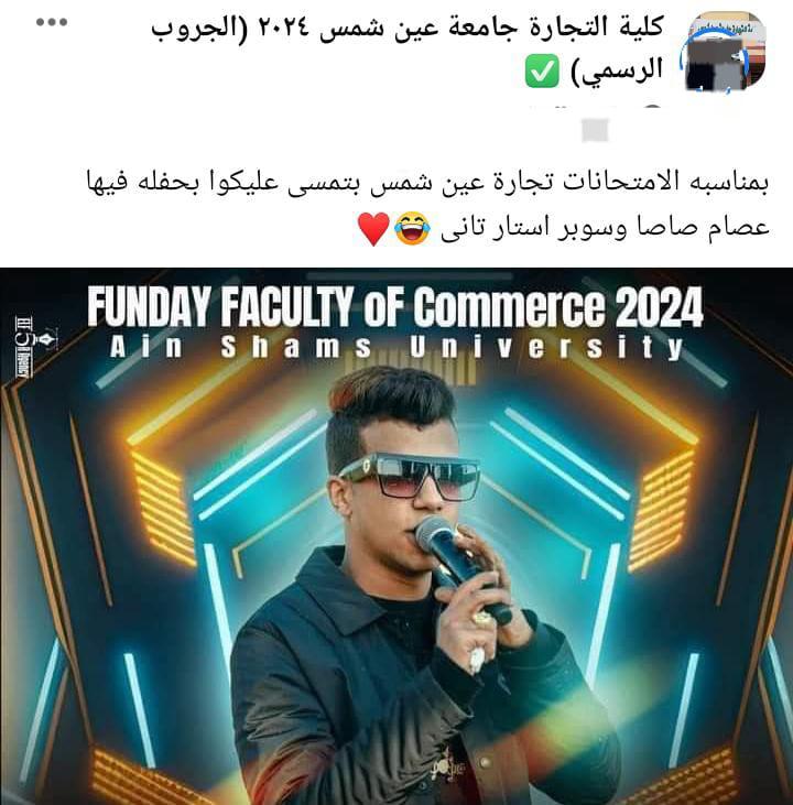 تداولت بعض الجروبات الخاصة بالطلاب عبر موقع “فيسبوك” خلال الساعات الماضية، منشورًا بشأن إقامة حفلة “فان داي” Fun Day لطلاب كلية التجارة بجامعة عين شمس قريبًا بحضور المغني الشعبي عصام صاصا، مما أثار حالة من الجدل بين بعض الطلاب الذي طالبوا بعدم حضور هذه الحفلة خاصة مع أحداث غزة الأخيرة.