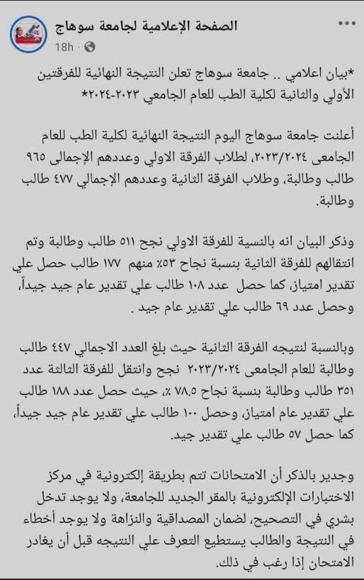 ما تم تداوله بشأن هذا الأمر غير صحيح، حيث أعلنت جامعة سوهاج أن الفرقة الأولى لكلية الطب قد نجح منها ٥١١ طالب وطالبة وتم انتقالهم للفرقة الثانية بنسبة نجاح ٥٣٪ منهم ١٧٧ طالب حصل علي تقدير امتياز، كما حصل عدد ١٠٨ طالب علي تقدير عام جيد جيداً، وحصل عدد ٦٩ طالب علي تقدير عام جيد.