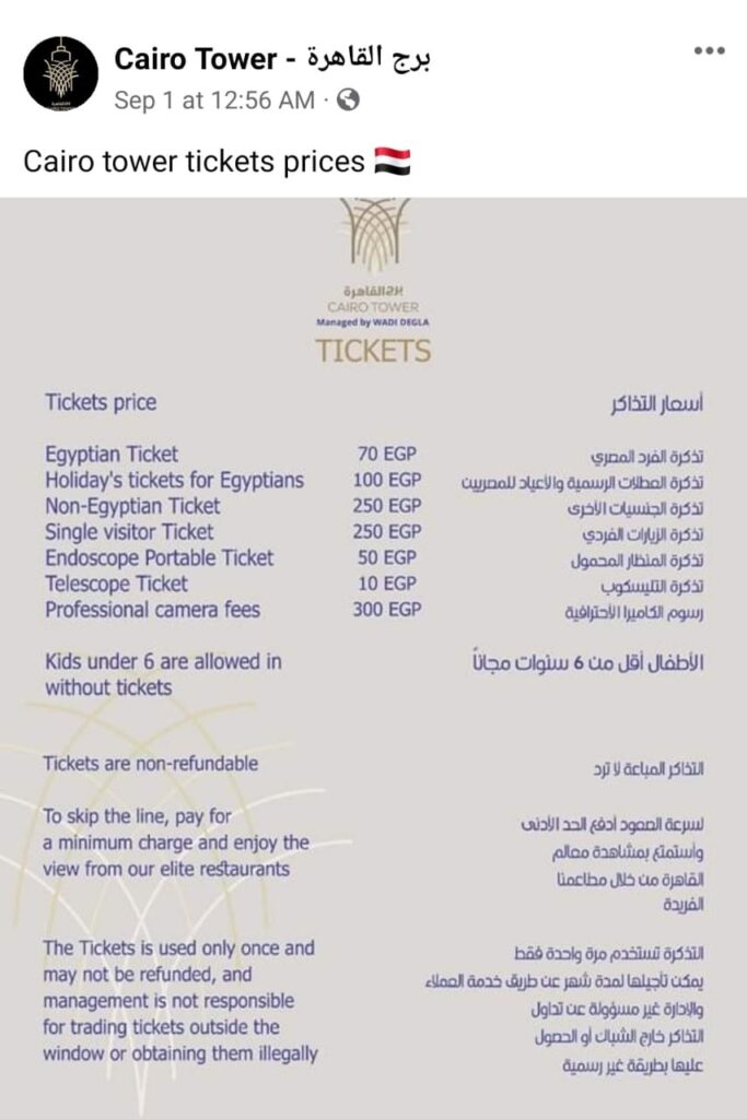 تداولت بعض حسابات وسائل التواصل الاجتماعي في مصر بالفترة الماضية، أنباء بشأن زيادة سعر تذاكر الدخول إلى برج القاهرة إلى 250 جنيهًا للمصريين والأجانب، الأمر الذي أثار عدة تساؤلات تجاه حقيقة هذا السعر.