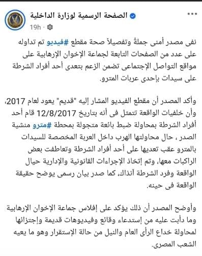 وأشارت الوزارة إلى أن الحادثة التي تم تصويرها وقعت بتاريخ 12 أغسطس 2017، حيث قام أحد أفراد الشرطة بمحاولة ضبط بائعة متجولة في محطة مترو منشية الصدر، وحاولت البائعة الهرب إلى العربة المخصصة للسيدات داخل المترو بعد تعديها على أحد أفراد الشرطة، مما أدى إلى تدخل بعض الراكبات لتعاطفهن معها، لافتة إلى أنه تم اتخاذ الإجراءات القانونية والإدارية اللازمة بشأن الواقعة في ذلك الوقت، كما صدر بيان رسمي في حينه يوضح حقيقة الحادثة وما حدث لفرد الشرطة المعني.