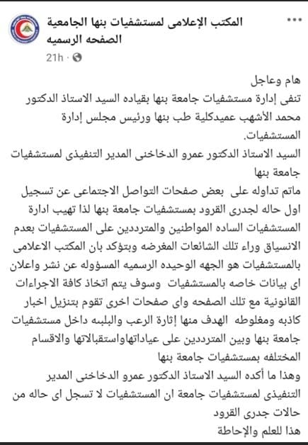 وأكدت إدارة مستشفيات جامعة بنها أنها الجهة الوحيدة الرسمية المسؤولة عن نشر وإعلان أي بيانات خاصة بالمستشفيات، مشيرة إلى أنه سيتم اتخاذ كافة الإجراءات القانونية مع الصفحة التي قامت بنشر هذه المزاعم، وأي صفحات أخرى تنشر أخبارًا كاذبة ومغلوطة الهدف منها إثارة الرعب والبلبلة داخل مستشفيات جامعة بنها، وبين المترددين على عياداتها واستقبالاتها والأقسام المختلفة.